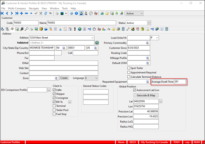 If a customer’s address is not linked to the Places API, the TRIMBLE_PLACE_ID column is populated with the CLIENT_ID value. TruckMate uses this value to read the average dwell time from the MAPS_API_DATA table.