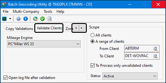 The Scope settings are used to determine which zone codes/clients to include. Some of the settings are common to all the batch geocoding validation functions. Others will appear depending on the validation function.