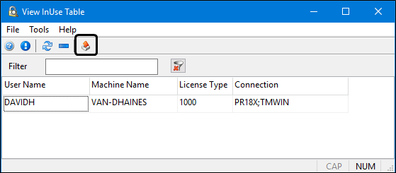 In the Filter field, you can enter information (i.e. user name, machine name, license type, or connection) and press Enter to filter the results in the grid.