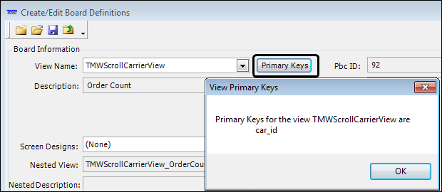 On the Board Definition window of the primary view, click Primary Keys. A window opens to display the key column names.