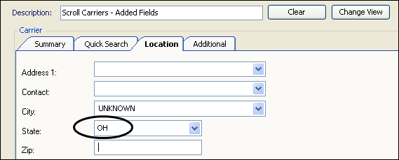 When the user opens the scroll window view or clicks New Search, the default value will automatically populate the restriction field. This sample shows OH selected as a default retrieval value.