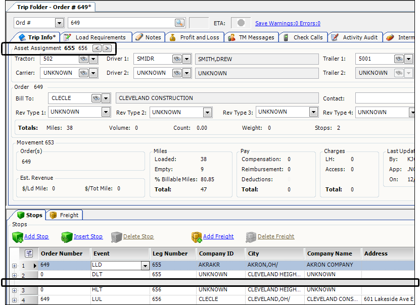 To see details for a split trip, look it up in the Trip Folder. Order 649 is shown below. Our sample trip is divided into two trip segments. You can use the arrow buttons in the Asset Assignment section to toggle between these trip segments. The number of the selected trip segment appears in bold, and the associated trip segment information appears in the Trip Info tab.