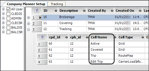 1. In the Company Planner Setup window, select a board and Grid cell type. For example, select the Brokerage board and its Carrier Load Information cell.