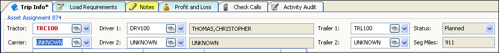 You can use the fields in the top section of the Trip Folder’s Trip Info tab to assign a tractor, drivers, trailers, and/or a carrier to a trip. The system automatically changes the status of the trip to Planned. It displays the assigned resources on the Stops tab.