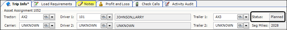 You cannot use the Trip Info tab to change the status of a trip to Dispatched, Started or Completed. You must use the Assign Driver/Equipment window instead.