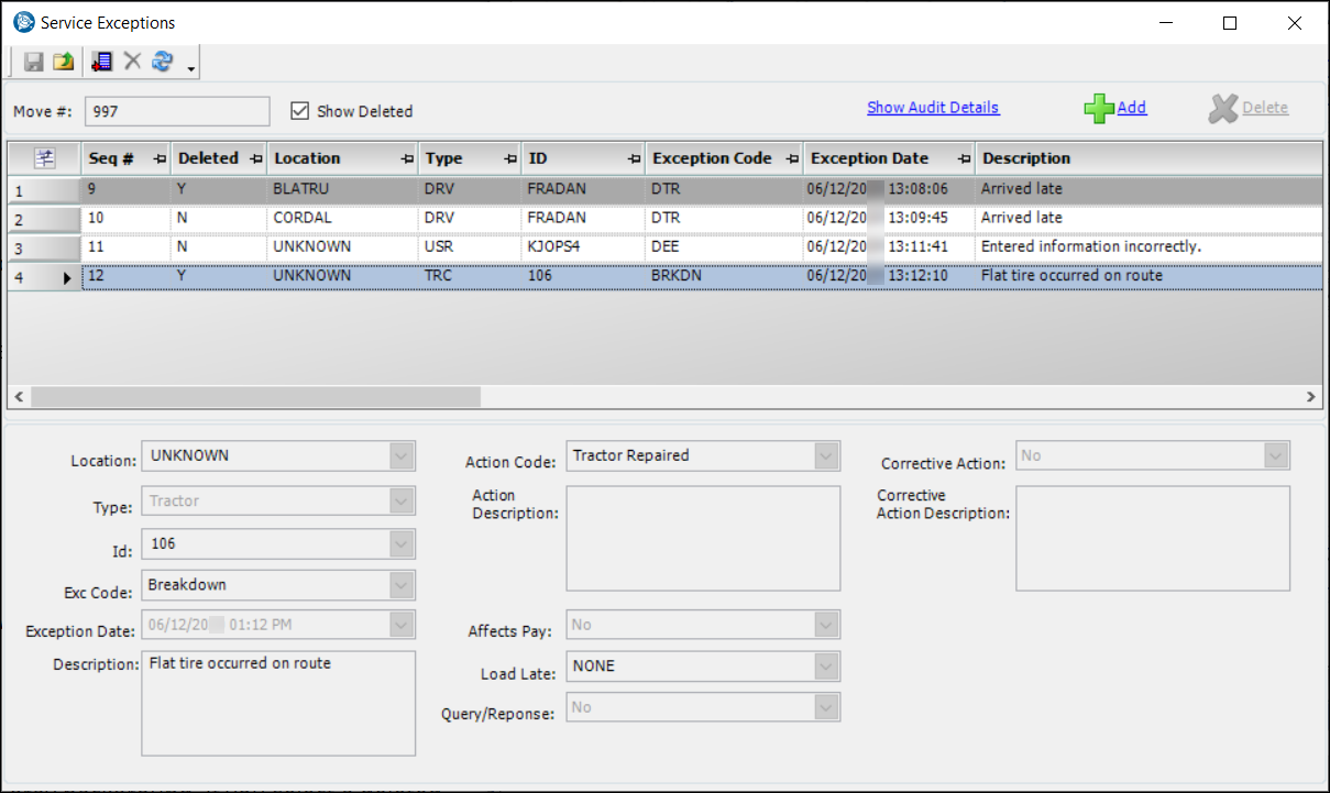 1. To preserve history on the move, deleting a service exception does not remove it from the database. It is still visible if you select the Show Deleted checkbox.