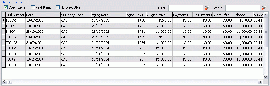 To find a specific Invoice issued to the selected Customer, enter the Invoice number in this field. Press the <Enter> key after entering the data to position the Grid at the first matching record. An arrow will appear to the left of the Grid to indicate the selection.