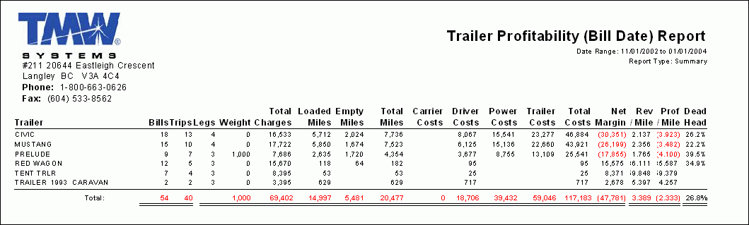 • The Summary report lists the 'Trailer' and the number of 'Bills/Trips/Legs' attached to it, as well as the Power Unit’s 'Loaded/Empty Miles', 'Loaded/Empty Ratio', 'Dead Head', 'Total Revenue', 'Daily/Weekly/30 day' Averages and, finally the Power Unit’s 'Revenue per Mile (loaded/total). The report will also generate a 'Totals' line consisting of all the revenue for all of your Power Units.