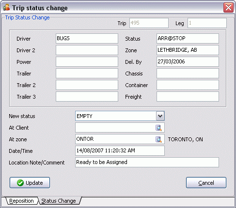 4. Select the 'Update' button. If the 'Update' button is un-selectable, you may have to adjust your permissions on the Security Setup program > Security > Business Events > Allow Changes Tab, in particular the 'DISPATCH - Allow Trip Status Change without <Resource>' option.