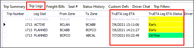 The TruETA Leg ETA and TruETA Leg ETA Status columns have been added to the Dispatch and Multi Mode Dispatch > Trip grids and the data displayed here will reflect TruETA updates to the trip legs status.