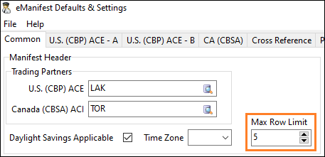 On the Common tab in the eManifest Defaults & Settings window, a new Max Row Limit field lets you define the maximum number of records that appear in the Manifests grid.