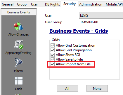A new option, Allow Import from File, lets users import data from a file into most TruckMate grids. The option is available on the Security tab in the Grids section.