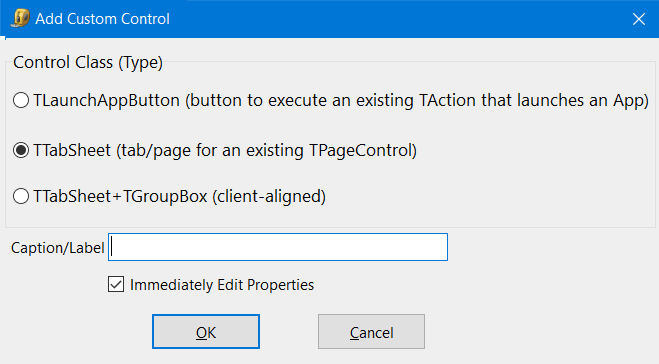 This adds a new Tab to the application. When adding a new Tab it’s best to start with naming the DBEdit and changing the Font if you wish. After making a Tab, you should create a Group Box to fill up the TabSheet. Important: When adding the Group Box make sure it’s 'Client' Aligned so that it fills up the whole TabSheet. Now, you can change the Name of the Group box and font if you wish. You can then 'Cut' and 'Paste' onto your new Tab, or create more Group Boxes and DBEdit’s for the Tab. Note: The Mouse must be on an existing tab title header when you select the Add a Custom Control menu option for a special Add Custom Control window containing this option to appear.