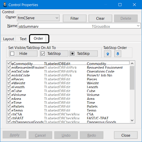 For all of these cases, you may move fields around within the Tab / form, and you may move the entire tab’s content (groupbox) as a single unit to another Tab. However, you may NOT move an individual control from the hosted Tab/form to another Tab or vice-versa. For example, you may NOT cut the 'Interliner' edit-pick field from the IP tab and paste it to the Summary Tab. Nor may you cut the 'Carrier Agent' edit-pick field from the Summary tab and paste it inside the IP group-box. You may however shrink the IP groupbox down on the IP tab (so it is not client-aligned) and then paste the Summary tab field to the IP tab (outside of the IP groupbox), and so on.