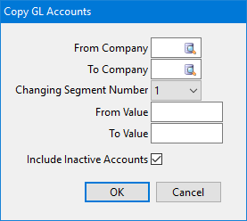 Accessible from the Multi-Company menu in the Accounting and Finance > General Ledger > GL Chart of Accounts program, this option allows you to quickly generate the chart of accounts for a new company, based on the chart of accounts for an existing company (substituting the company segment). When you select the option, a screen prompts you for a "from company" and a "to company". If you set these to 2 different companies, 3 other fields, Segment Number, From Value, and To Value become disabled and are auto-populated based on your GLACCOUNT entity labels setup (in Organizational Setup option in company profiles). Again, this is useful for quickly setting up the chart of accounts for a newly added secondary company. If you set the from/to companies to be the same, then the three fields become editable; you may choose which segment you want to change when you do the copy into the same company.