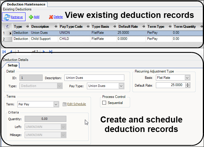 You set up a recurring deduction in the Deduction Maintenance window. To access the window, go to Tools > Setup > Recurring Adjustments > Deduction Maintenance.