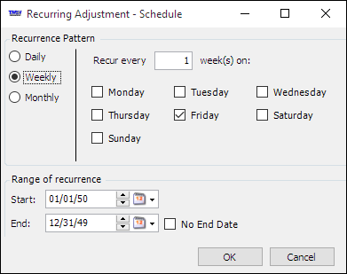 To save the schedule, click OK in the Recurring Adjustment - Schedule window.