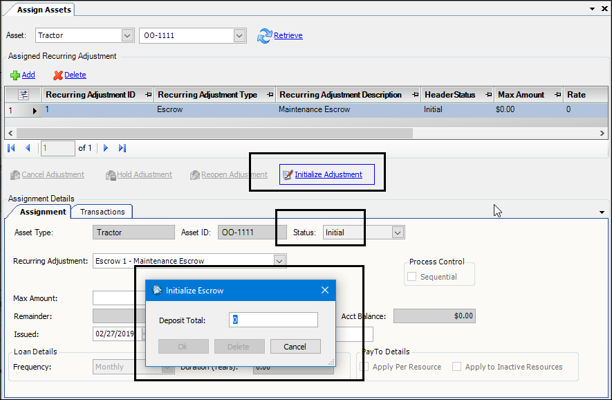 You can make initial deposits only when the escrow adjustment has a status of Initial. Once that status is Drawn, you can no longer make an initial escrow adjustment.