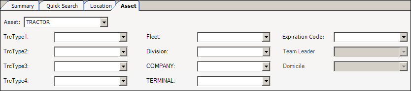 Profile type (company, carrier, driver, tractor, trailer). Note: The options available in the Asset field are determined by the available profile types. |