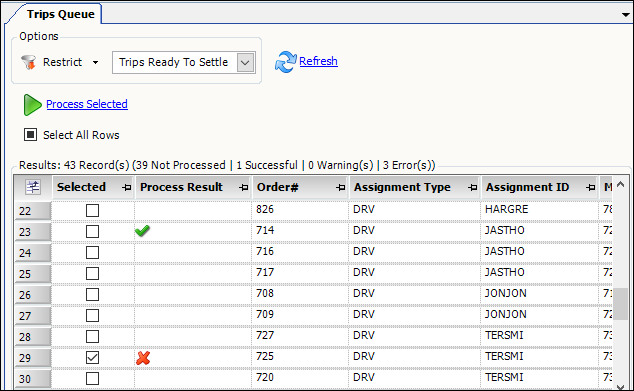 3. To view, add, edit, or delete pay for a processed trip in the Trips Settlements Folder, double-click a row in the queue.