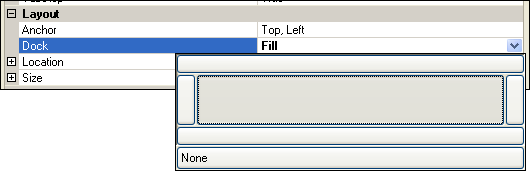 Most frequently, the object is set to fill the space of its container, but you can also select to dock the object to the top, bottom, left, or right. Click a selection bar or area to select it. Click None if you do not want to dock the object.