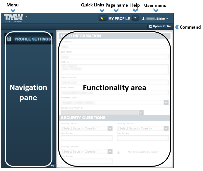 The functionality area is the main body of the page where the feature or function that you are using appears. Some pages contain multiple functionality sections.