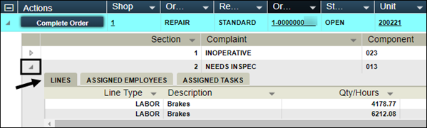 Expand next to a repair order row to view repair details such as Section, Complaint, and Component field information.