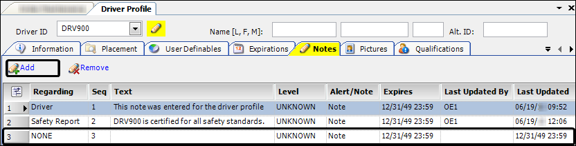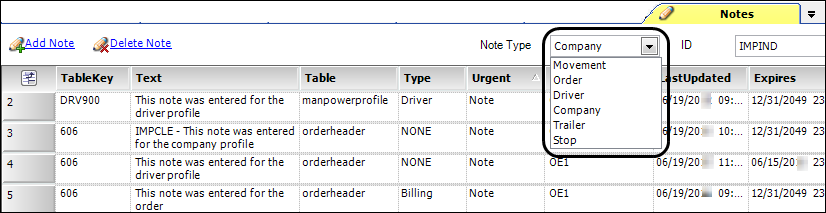 A profile is a record that contains details about an entity such as a specific company, driver, tractor, trailer, carrier, or commodity. You can add, change, or delete a note on the Notes tab in profile windows. In the Trip Settlements Folder and the Edit Invoice Folder, you will see profile notes automatically when you look up a trip to which the commodity, company, or resource is assigned. Therefore, changes to profile notes affect trips, as well as the profiles themselves.