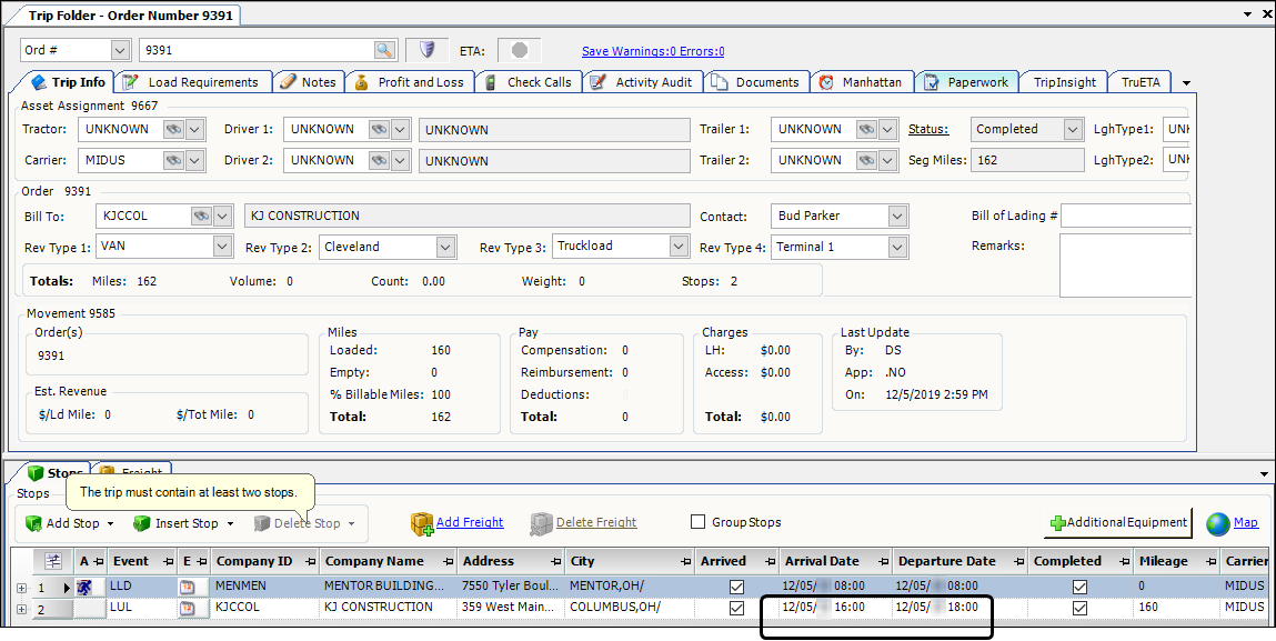 Our sample trip has two hours of detention time at the drop stop (from 16:00 to 18:00).