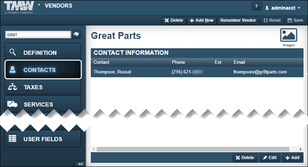 The Contact section shows the vendor’s phone, fax, and email information. You use this section to record the contact information for the vendor’s primary contact.