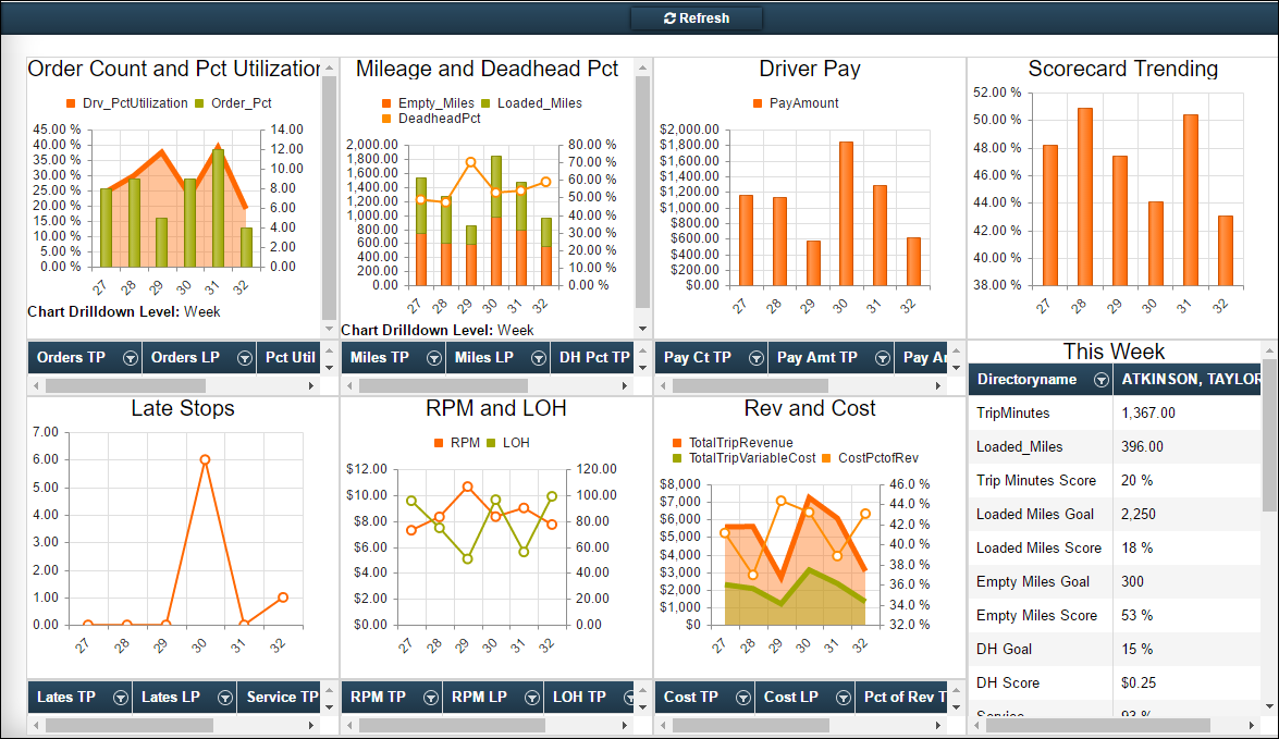 This information is shown as a dual graph. The columns show the number of orders the driver delivered per week. The line element shows the driver’s percent of utilization. |