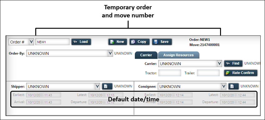 The system assigns a temporary order and move number to the record. The date/time fields default to the current date/time.