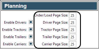 The Page Size fields allow you to specify the default number of records shown in the grids on these pages: