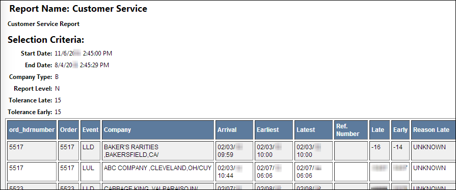 The Customer Service report option allows you to run a report to determine if shipments were early, late, or on time.