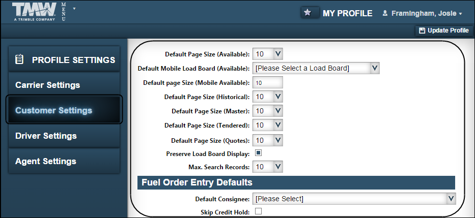 The appearance of your landing page is based on how the hosting company has set up the website and your user access to different applications. Your system administrator may have selected a particular application page, such as the View Available Loads page, as your landing page. You can change your landing page in your user profile.