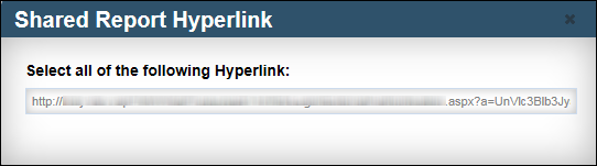 The Shared Report Hyperlink pop-up window opens with a hyperlink to a URL for this version of the report.