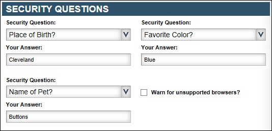 Up to three sets of security questions are available. Select a question from each one of the sets.