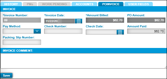 The tabs let you see and enter information about the RO’s history, PMs, work pending information, accounts, and user fields.